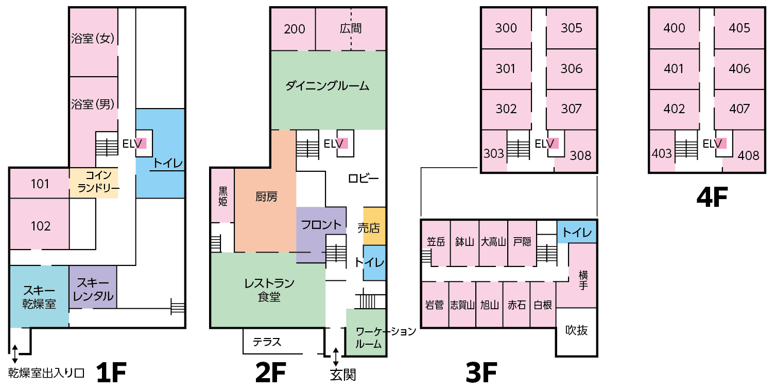 施設:レストラン・大浴場・売店・スキー乾燥室・コインランドリー